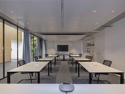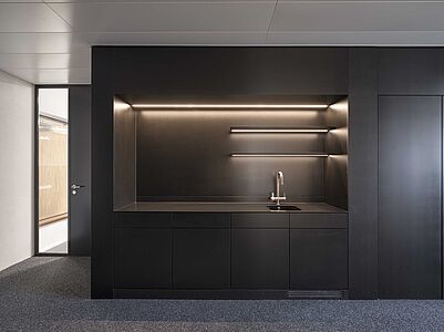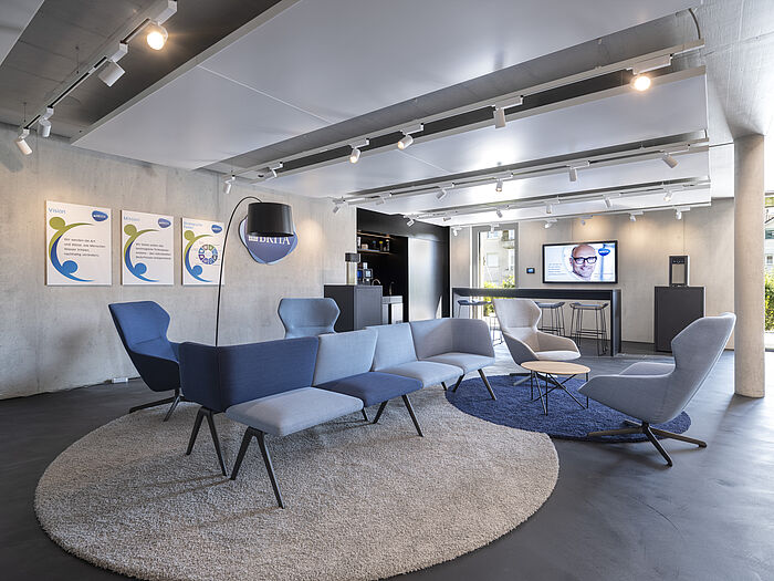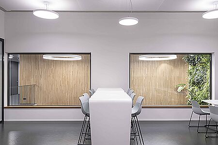 Neben den 45 hellen und modernen Arbeitsplätzen, welche alle behindertengerecht erreichbar sind, wurden weitere sehr attraktive Räume geschaffen, welche das Arbeitsklima und das Wohlbefinden der Mitarbeitenden zukünftig erhöhen. Da sind z.B. Rückzugsräume für Besprechungen oder konzentriertes, ruhiges Arbeiten, sowie auch Meetingräume für Treffen und Verpflegung. Eine luftige, zweigeschossige Halle, die man durch den portikusähnlichen Haupteingang betritt, verbindet den alten und mit dem neuen Gebäudeteil, und eröffnet den Mitarbeitenden und Besucherinnen einen grosszügigen Raumeindruck mit spannenden Durchblicken und attraktiven Sichtachsen. Dieser lebendigen Halle angegliedert ist ein Showroom, in welchem die Produkte der Brita präsentiert werden, und wo sich Besucherinnen und Mitarbeitende treffen können. Dieser offene Erlebnisraum bietet Ausblicke in die Landschaft und wird durch einen vertikalen Garten bereichert, welcher neben dem visuellen Erlebnis auf vielfältige Weise das Raumklima verbessert. Dieser Garten verkörpert sehr schön das ökologische Engagement der Firma BRITA.