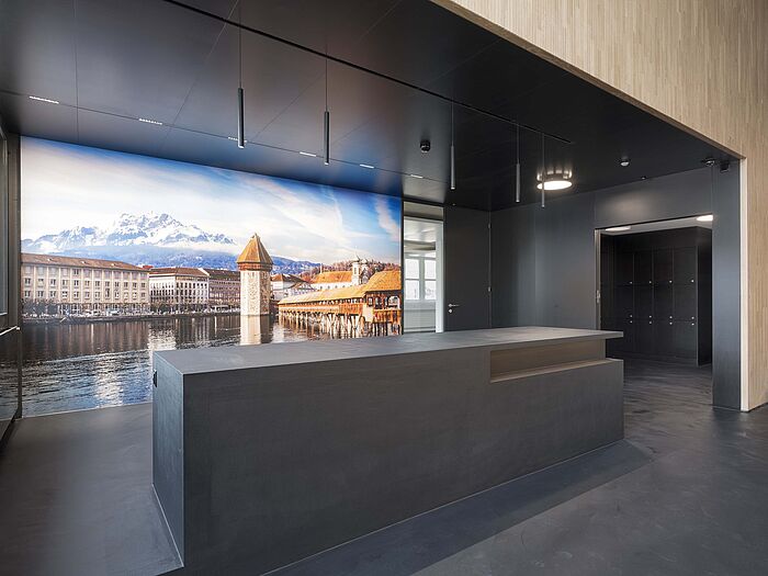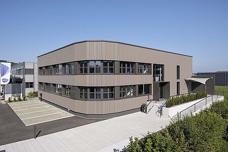 Das zeigt sich auch im Aussenbereich, wo Asphalt- und Betonflächen aufgebrochen und durch naturnahe Magerwiesenflächen ersetzt wurden. Der Haupteinang wurde neu gestaltet und akzentuiert. Verschiedene Gestaltungselemente wie Plattenbeläge, wegführende Sitzelemente, dezent platzierte Leuchtreklamen und eine naturnahe Bepflanzung haben den Hauptzugang optisch aufgewertet.