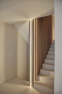 Im Inneren kommen natürliche Materialien zur Anwendung, die zu einer zurückhaltenden Schönheit mit grosser haptischer Qualität führen. Eichenholz, gediegene Bodenbeläge, Sumpfkalkputz und partiell historische, schön ornamentierte Keramikkacheln widerspiegeln das ästhetische Empfinden der Bauherrschaft. Sowohl im Scheunenraum als auch im Wohnraum ist die alte Holzkonstruktion sicht- und erlebbar. Dies als Referenz für den Ort und die Geschichte des umgenutzten Gebäudes.
