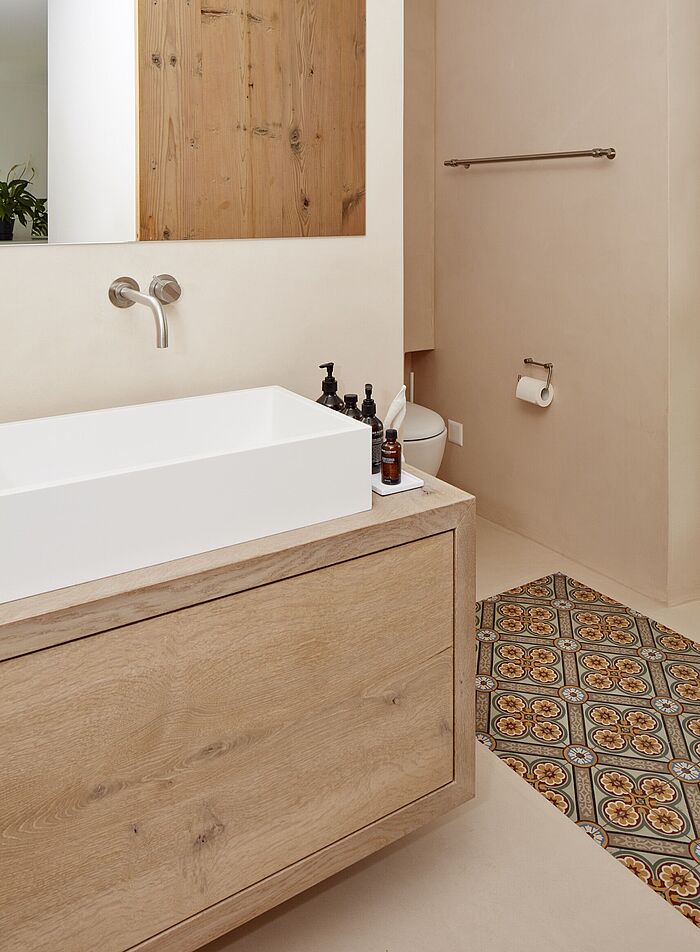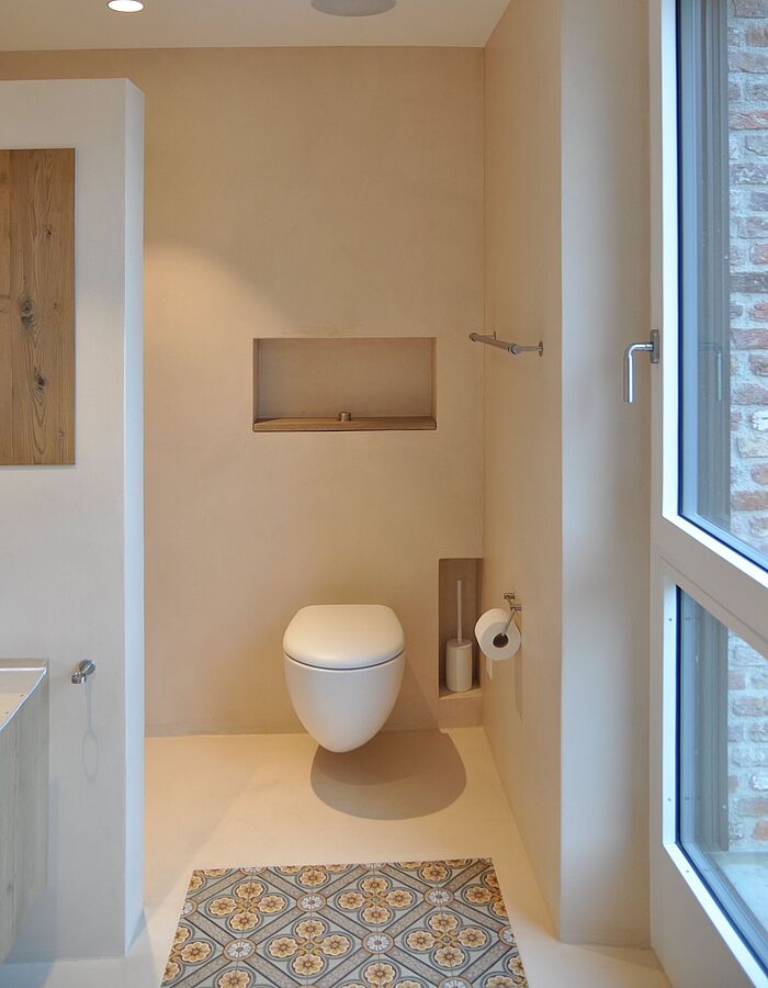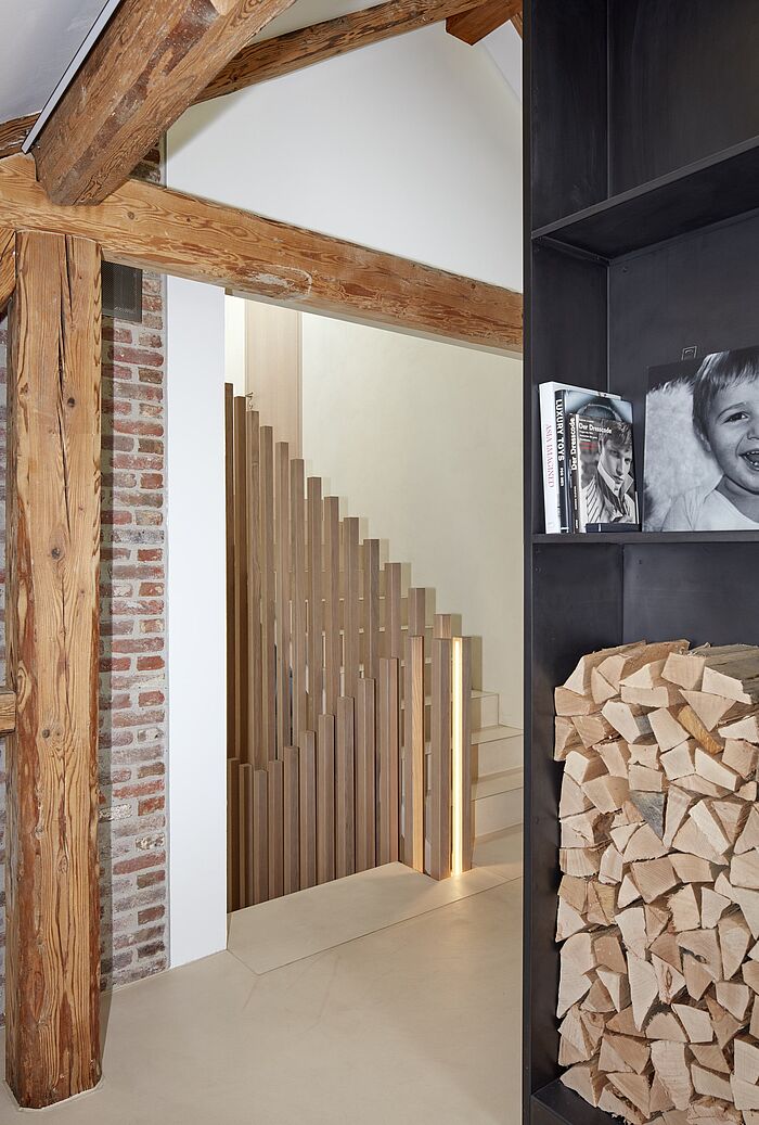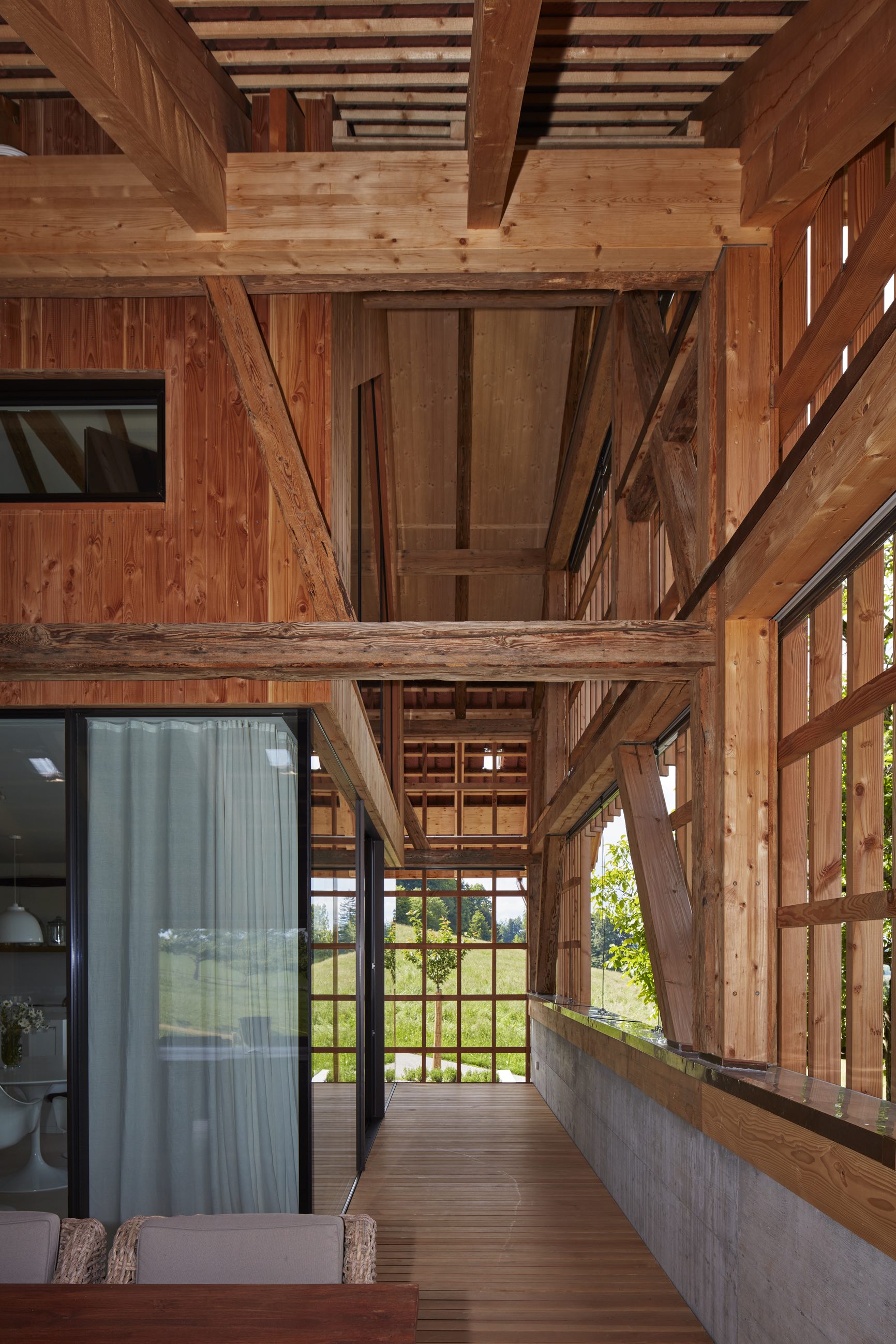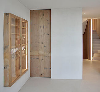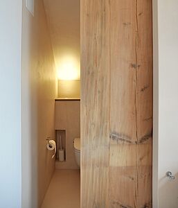 Im Inneren kommen natürliche Materialien zur Anwendung, die zu einer zurückhaltenden Schönheit mit grosser haptischer Qualität führen. Eichenholz, gediegene Bodenbeläge, Sumpfkalkputz und partiell historische, schön ornamentierte Keramikkacheln widerspiegeln das ästhetische Empfinden der Bauherrschaft. Sowohl im Scheunenraum als auch im Wohnraum ist die alte Holzkonstruktion sicht- und erlebbar. Dies als Referenz für den Ort und die Geschichte des umgenutzten Gebäudes.