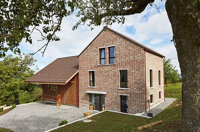 Die beiden Gebäude sprechen eine einfache und ortstypische Formensprache. Die Scheune aus naturbelassenem Douglasienholz. Das Wohnhaus aus Recycling-Backstein. Die Materialwahl für die Fassade ist einfach, ehrlich und wurde in präziser Detaillierung konsequent umgesetzt.