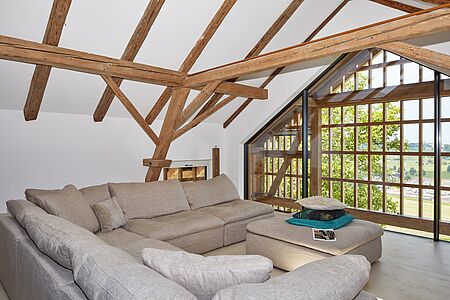 Die Aussicht ist fantastisch! Hinter der hölzernen Lamellenfassade, die der Scheune ihr typisches Erscheinungsbild verleiht, verbergen sich grossflächige Fensterfronten, die den Ausblick talwärts nach Beromünster fokussieren. In den Schlafzimmern ist die schöne Lage im Grünen durch gut proportionierte Lochfenster erlebbar.