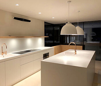 Innovative, clevere und energiesparende Gebäudetechnik ist in diesem Haus Standard. Alle elektrischen Komponenten inklusive Audio- und Videosystem lassen sich via Smartphone überwachen und steuern. Die Haustechnik ist unaufdringlich und wenig sichtbar.